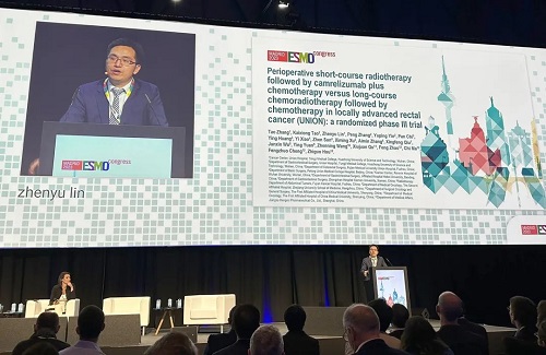 10月21日,尊龙凯时Ag医药创新药卡瑞利珠单抗(艾瑞卡®)的一项研究“新辅助短程放疗序贯卡瑞利珠单抗联合化疗对比长程放化疗序贯化疗治疗局部晚期直肠癌”随机对照Ⅲ期试验(UNION) 以优选口头报告的形式正式亮相。该研究由华中科技大学同济医学院附属协和医院张涛教授、陶凯雄教授担任主要研究者,华中科技大学同济医学院附属协和医院林振宇教授在马德里现场报告了该重磅研究的结果1,此项研究是全球首个评估短程放疗序贯免疫治疗联合化疗治疗局部晚期直肠癌的Ⅲ期研究,已达到主要终点病理完全缓解(pCR),有望为直肠癌患者的治疗提供新策略。